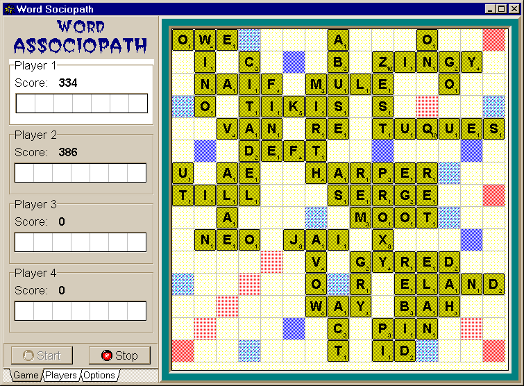A crazy romp into the world of topsy-turvy letter-schenannigans! Actually it's pretty much like Scrabble(TM)(R)(C). But it's pretty cool. It's also very buggy, unfinished, and slow. But it's still pretty cool, for having written most of it in two days. With Borland's Delphi , of course! Yeah, yeah, I'll put the source code out here later when I'm not ashamed of it.